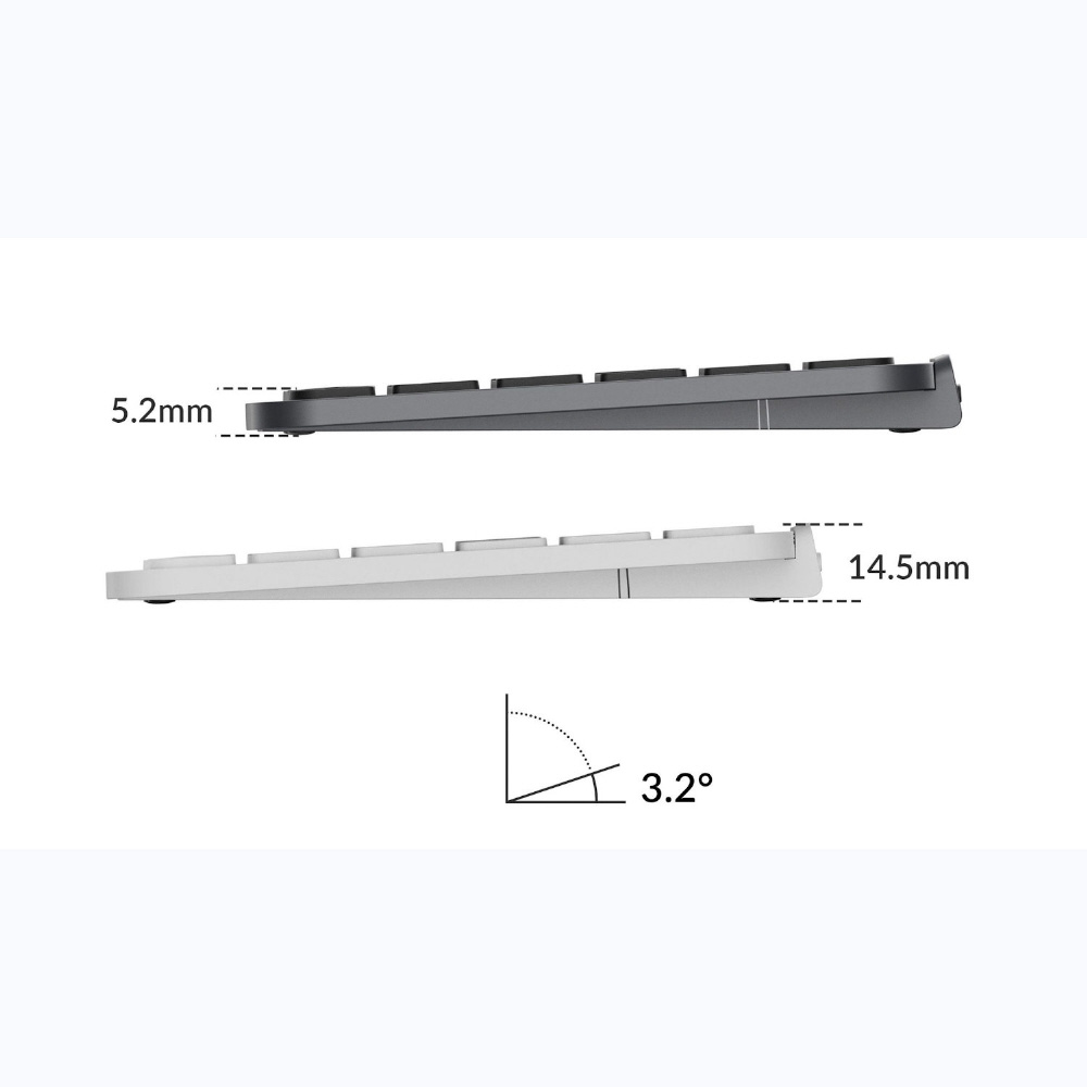 チルト角3.2度、厚さ5.2mmの超薄型の一体型ボディで、タイピング時の安定性を確保し、長時間のタイピングでもぐらつかず疲れにくいのが特徴です。
