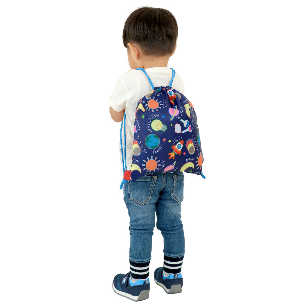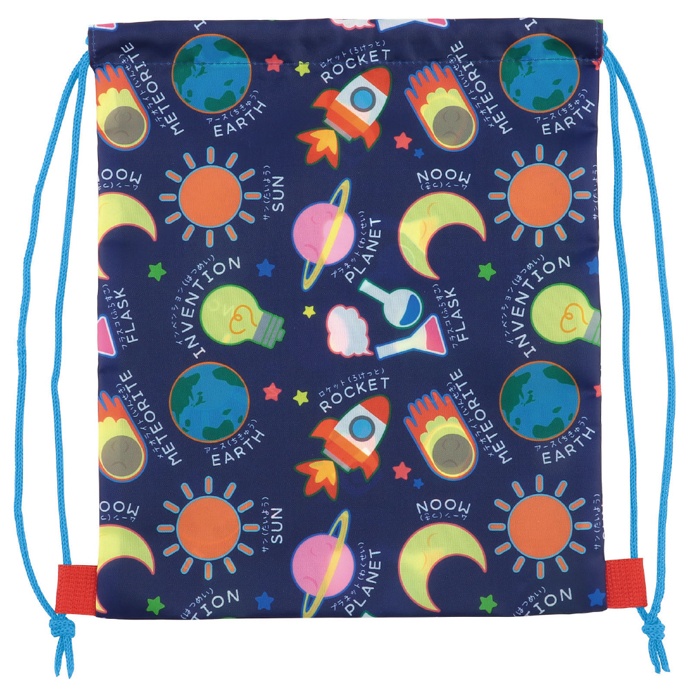ワクワクが詰まったサイエンス柄のナップザックです。イラストと英単語が書いてあるので、英語の勉強にも!