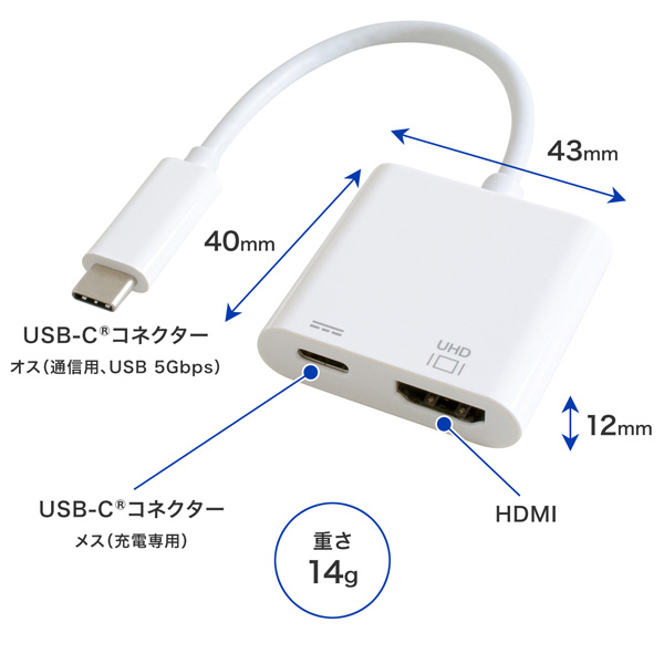 映像変換アダプタ [USB-C オス→メス HDMI /USB-Cメス(給電用 PD100W対応)] 4K対応 ホワイト GP-CHDH100/W [4K]