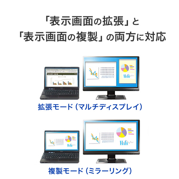 「拡張モード」と「複製モード」の両方に対応。拡張モードでは、パソコン画面と追加ディスプレイの画面を別々に表示でき、複製モードでは、パソコンと追加ディスプレイの画面が同じになります。