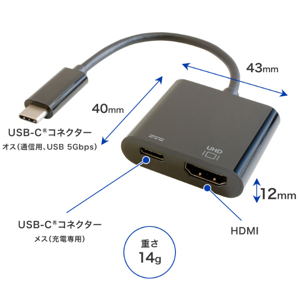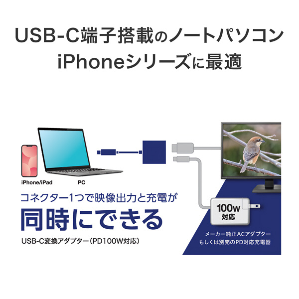 USB-C(USB Type-C(R))のみを搭載した薄型ノートパソコンやiPhoneシリーズ(16eを除く)に最適です。USB-Cコネクター1つでHDMI映像出力と充電が同時に行えます。