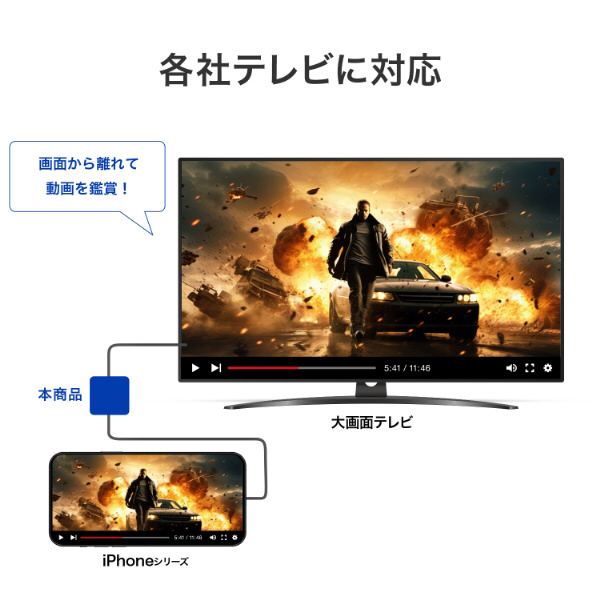 iPhoneシリーズ(16eを除く)、iPad Air、iPad Proの画面をテレビに出力でき、動画鑑賞を大画面のテレビで快適に楽しむことができます。画面から離れて視聴できるため、目への負担を軽減できます。また、充電しながら使用できるため長時間の使用でもバッテリー切れの心配がなくなります。