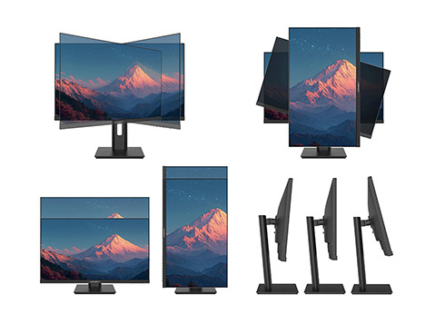 ■高さ調整が可能な昇降式多機能スタンドを搭載、最大140mmの範囲(横置時)で最適な高さに画面を調整可能です。また縦画面として使用出来るピボット(回転)機能にも対応します。スイーベル(首振り)機能は、左右各30°の範囲で動かせます。