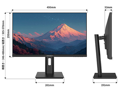 本体サイズ スタンド付:高さ 横置き346-486/縦置き505-578x幅 横置き490/縦置き293x奥行191mm スタンド幅201mm
