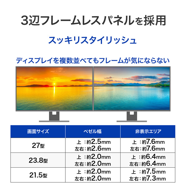 極細フレームですっきりした印象を与え、マルチディスプレイにもオススメです。