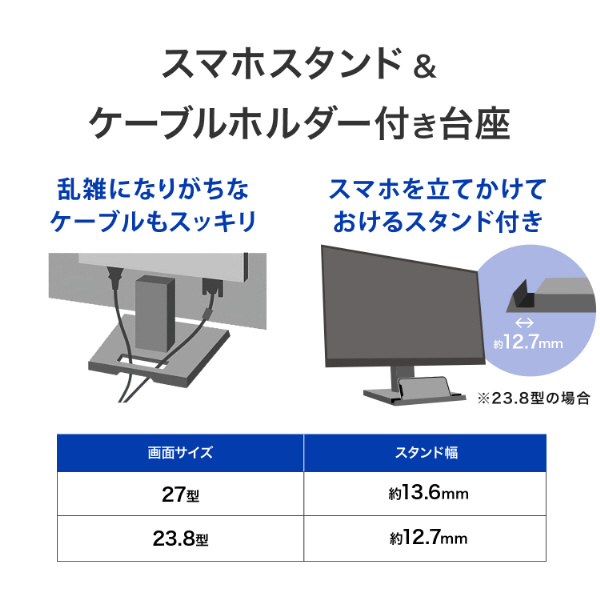 ケーブルをスッキリとまとめられるケーブルホルダー付きの台座を採用。