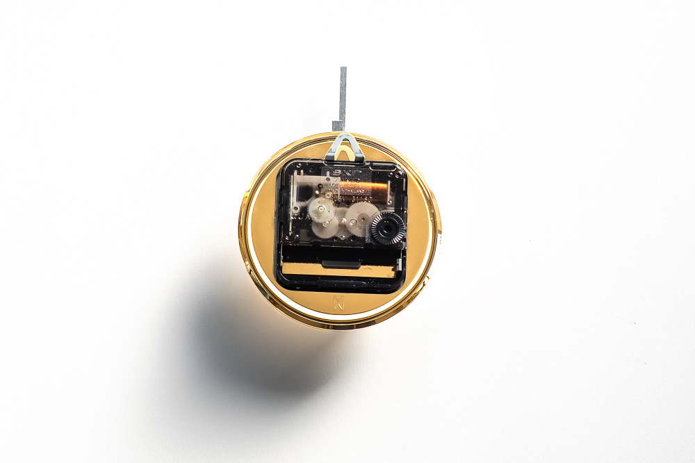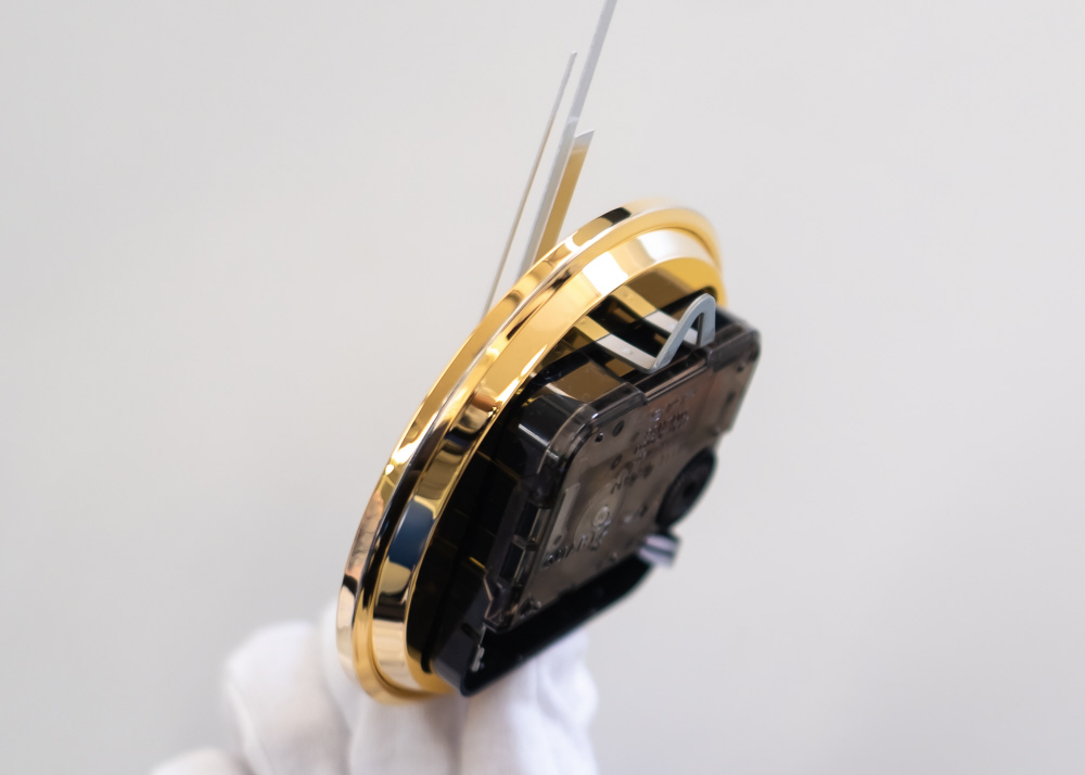「めっき」処理により全面が金属質感の時計。「陽光」は本物の金による表面仕上げです。