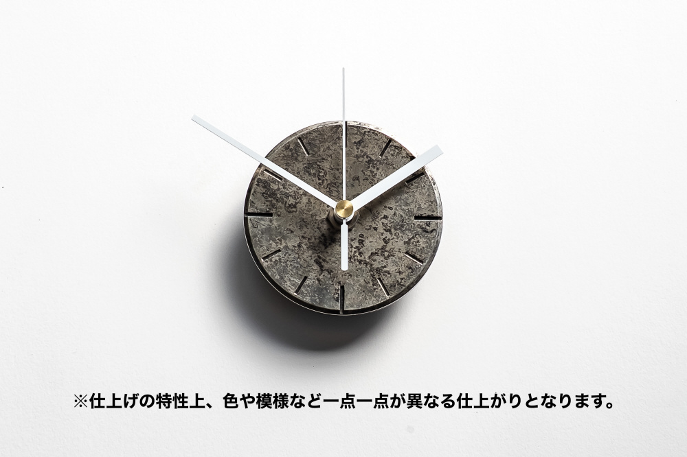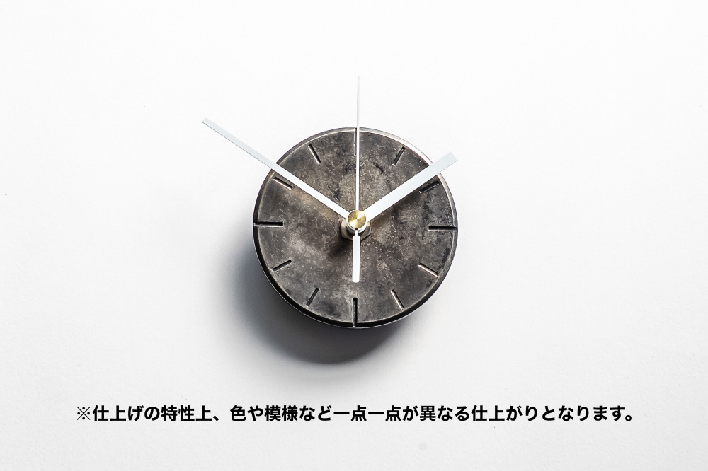 「めっき」処理により全面が金属質感の時計。「夜空」は銀色の金属に対し、薬品処理による化学反応で生じた色や唯一無二の模様をいかして仕上げています。