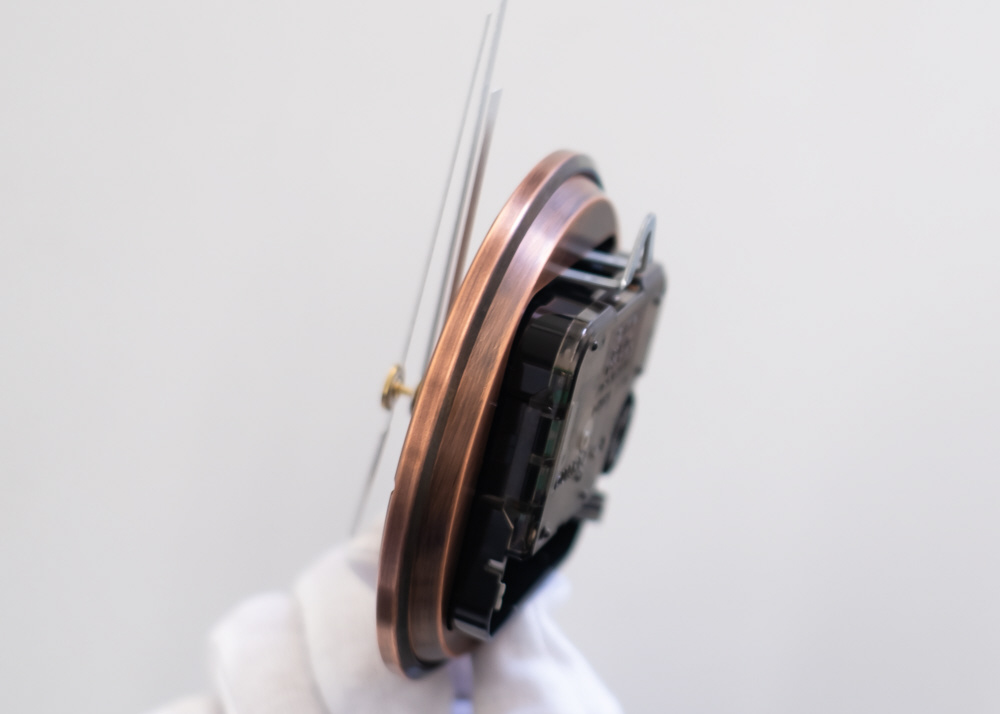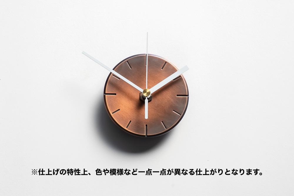 「めっき」処理により全面が金属質感の時計。「木陰」は銅に対し、薬品による化学反応で色をつくり、手作業で模様を出すことで仕上げています。