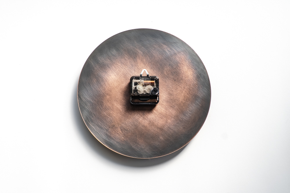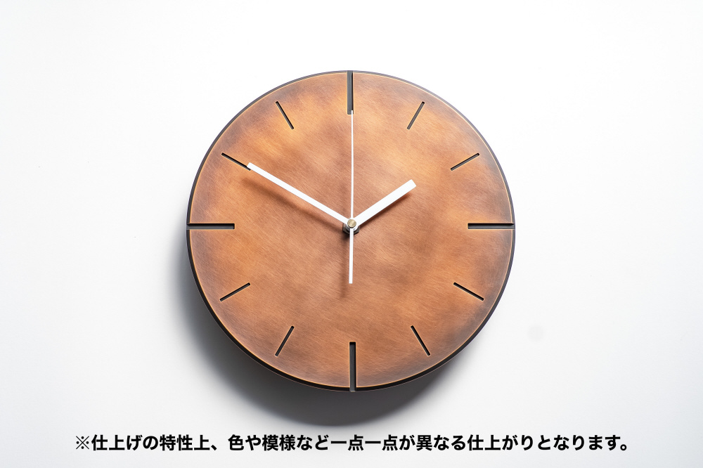 「めっき」処理により全面が金属質感の時計。「木陰」は銅に対し、薬品による化学反応で色をつくり、手作業で模様を出すことで仕上げています。