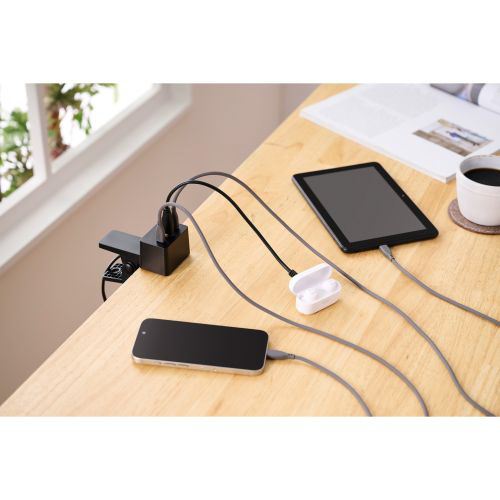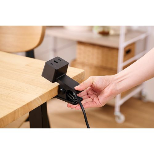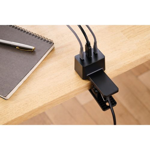 机などに挟んで使用できる、クリップ機構を備えたAC充電器です。2つのUSB Type-C(TM)ポートと1つのUSB-Aポートを搭載し、最大3台のデバイスを同時に接続できます。固定使用だけでなく、充電器を常設できないダイニングテーブルなどでテレワークや宿題をする際に、一時的に設置して利用するのにも便利です。