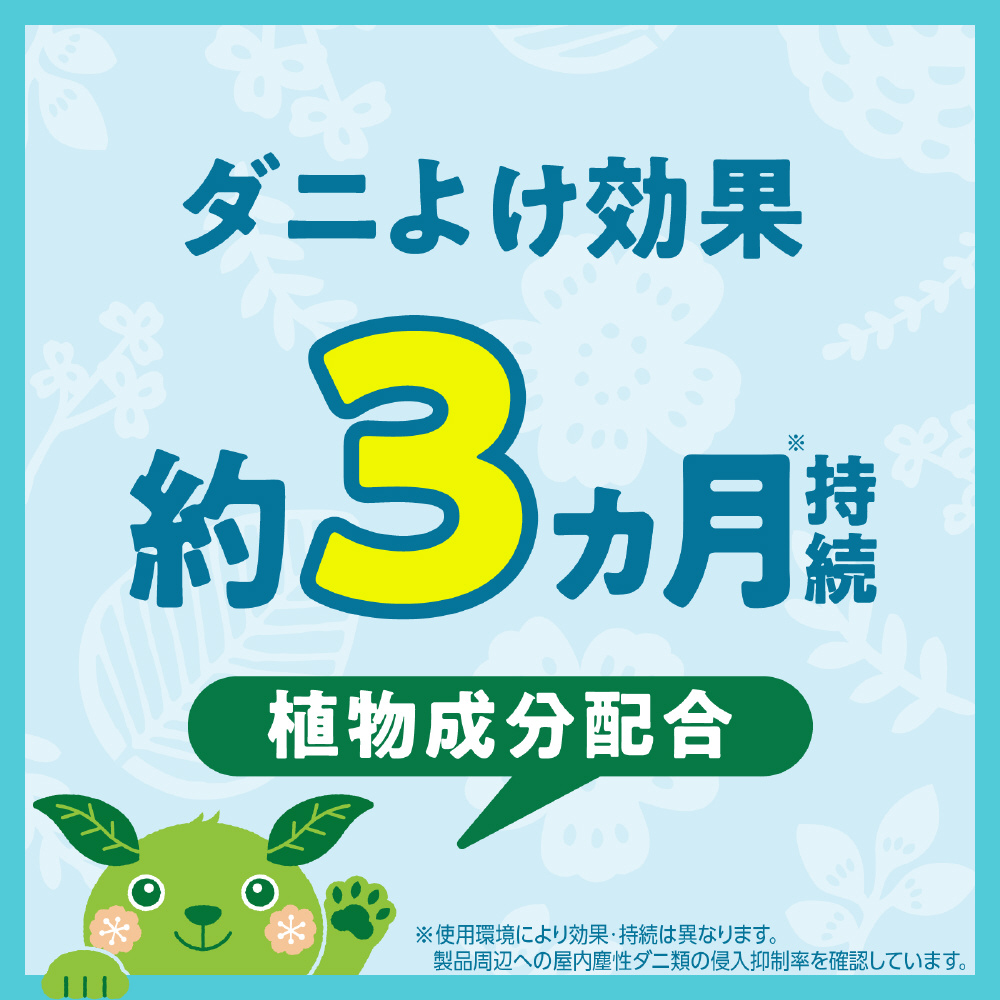 ●植物成分配合で、ダニよけ効果が約3ヵ月持続します。(使用環境により効果・持続は異なります。製品周辺への屋内塵性ダニ類の侵入抑制率を確認しています。)