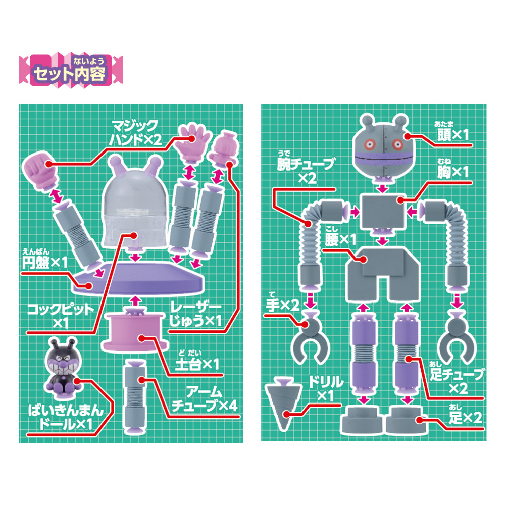 さらに、チューブの曲げ伸ばしをしたり、吸盤で組み替えたりすることで、自分だけのバイキンメカを作って遊ぶことができます!