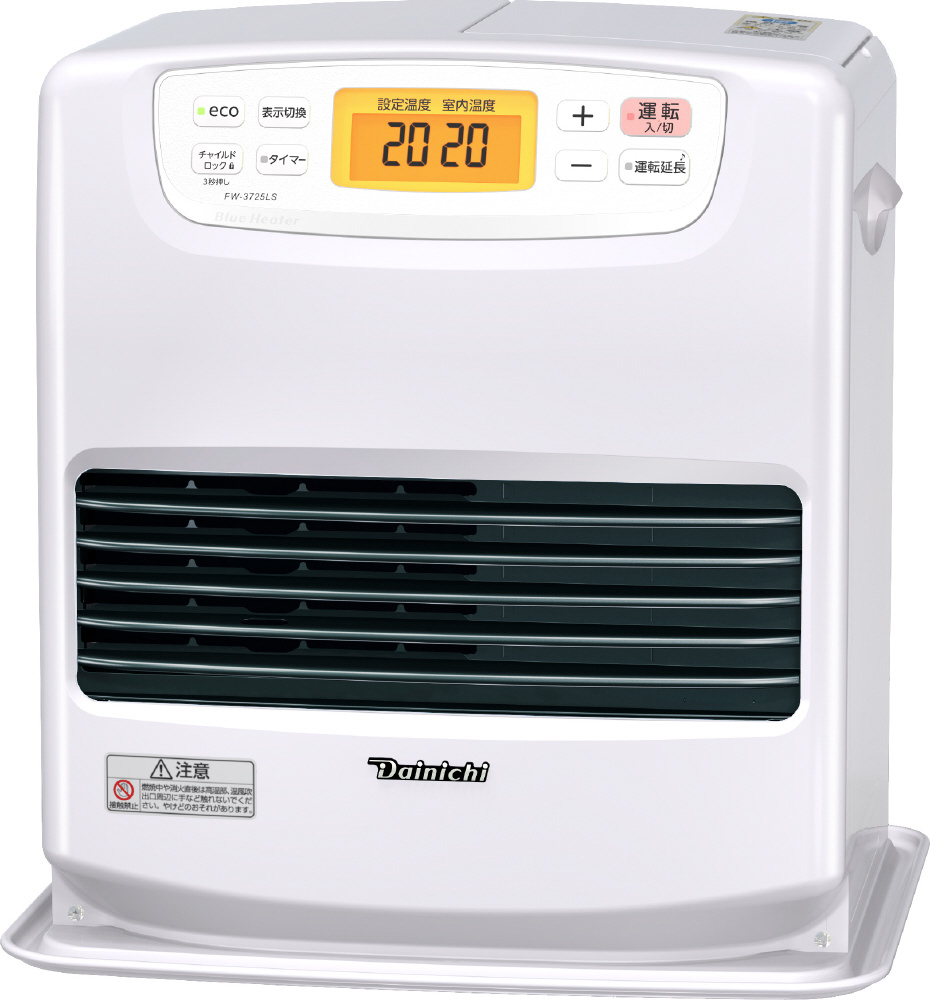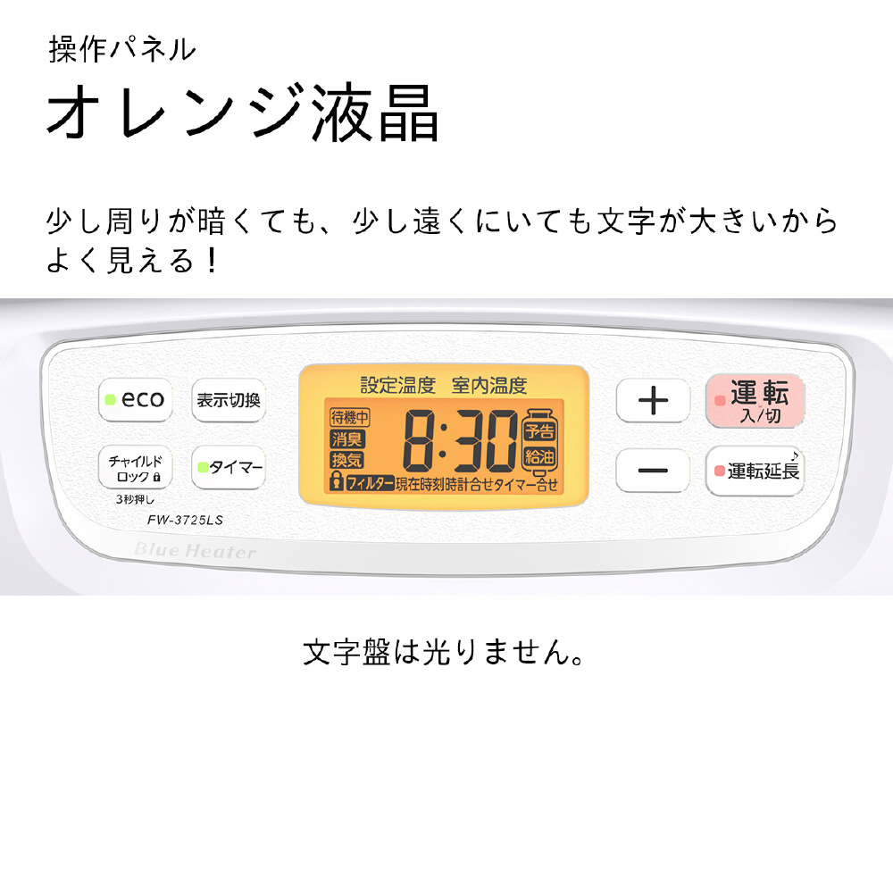安全機能 不完全燃焼防止装置、対震自動消火装置、停電安全装置、過熱防止装置、燃焼制御装置、点火安全装置、消し忘れ消火装置、気密油タンクの給油時消火装置、室温異常高温防止装置
