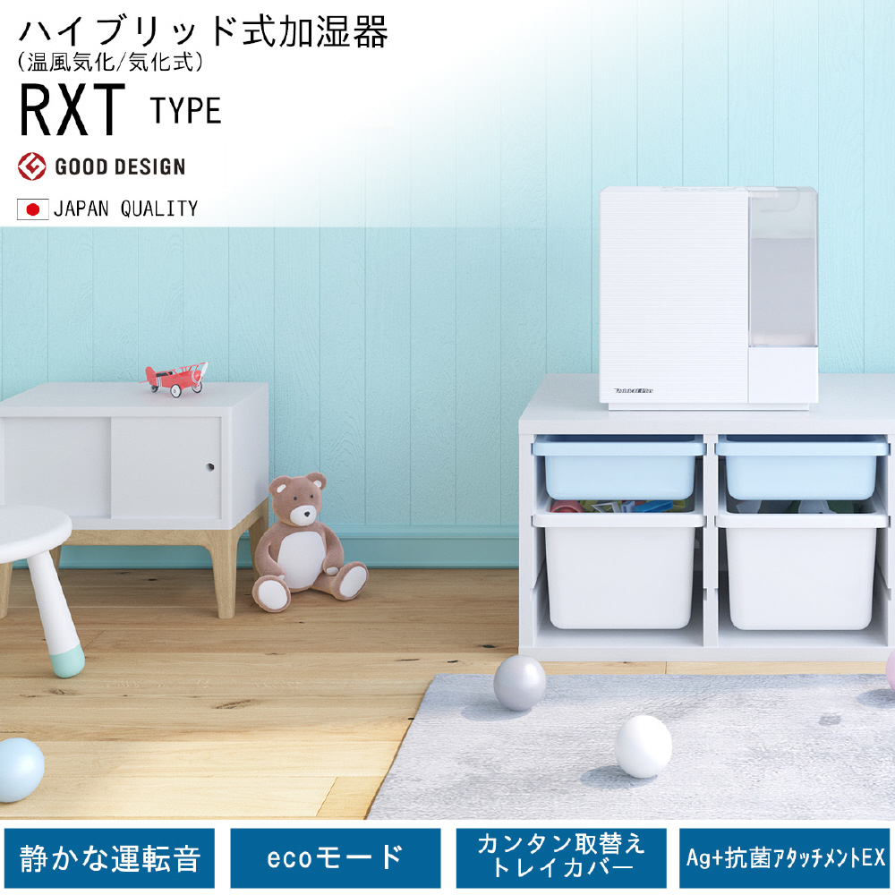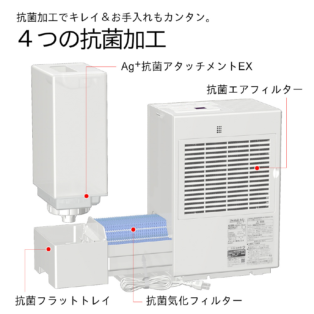 気化ハイブリッド式加湿器。定期的なお手入れ不要の取替えトレイカバー搭載。お部屋を選ばないデザインモデル。