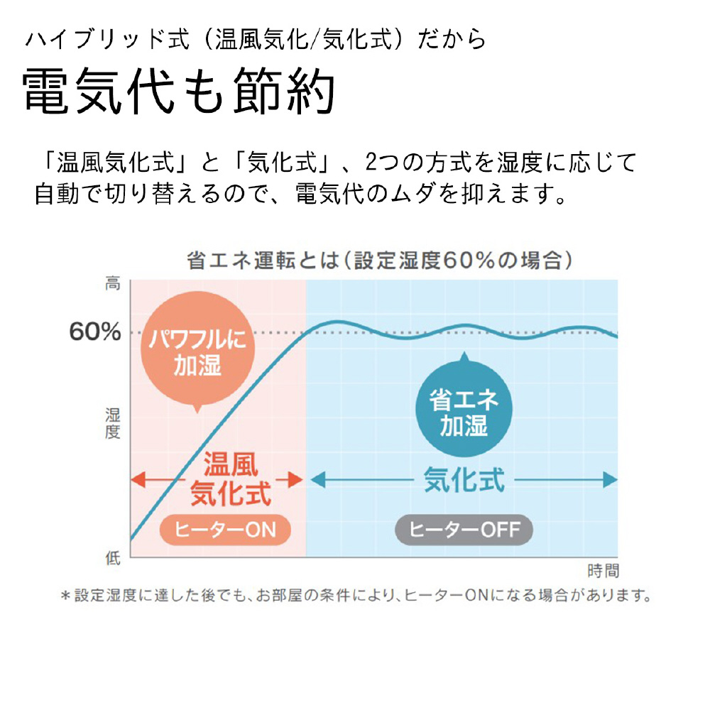 「eco」運転モードに設定すると、常時ヒーターレスの気化式で運転するので、電気代をさらに節約。