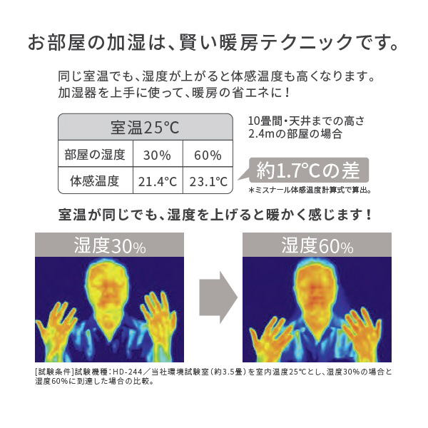50・55・60・65・70%の5段階で湿度設定が可能。設定した湿度に合わせて自動で加湿量を調整しながら運転します。