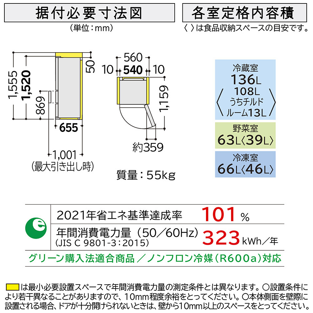 年間消費電力量 323kWh/年(JIS C 9801-3:2015)