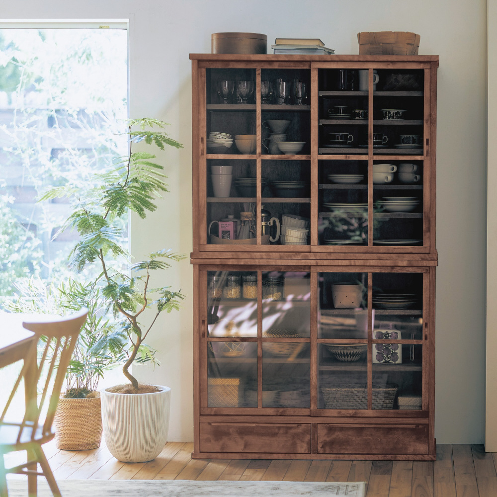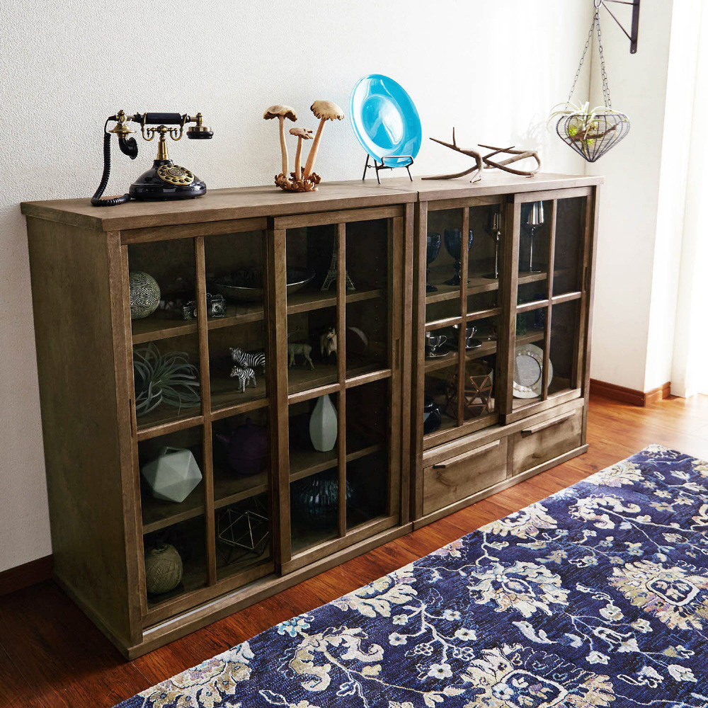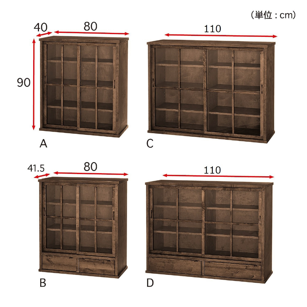 ・ガラス戸のみと引出し付きの2タイプ。サイズはそれぞれ幅80cmと幅110cmをご用意。同サイズをスタッキングすれば、省スペースで収納力がアップ。引出し付きのC・Dタイプを上にスタッキングすることも可能です。単体は高さ90cmなので、天板をディスプレイ棚としても◎