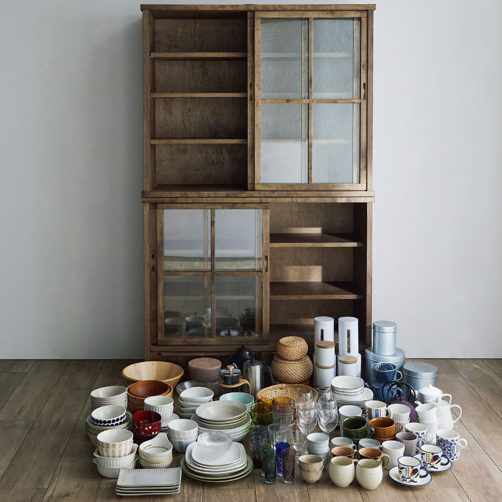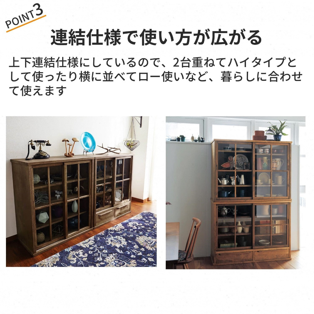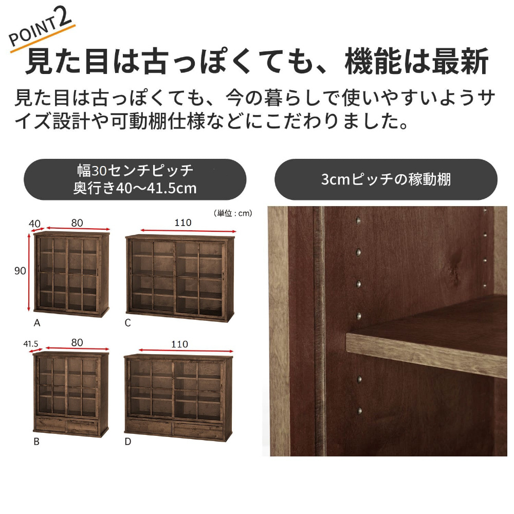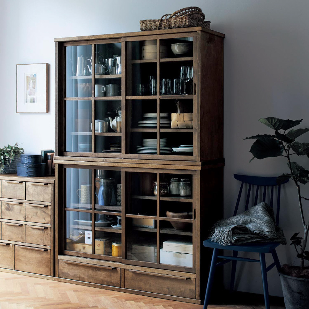 ・ガラス戸のみと引出し付きの2タイプ。サイズはそれぞれ幅80cmと幅110cmをご用意。同サイズをスタッキングすれば、省スペースで収納力がアップ。引出し付きのC・Dタイプを上にスタッキングすることも可能です。単体は高さ90cmなので、天板をディスプレイ棚としても◎
