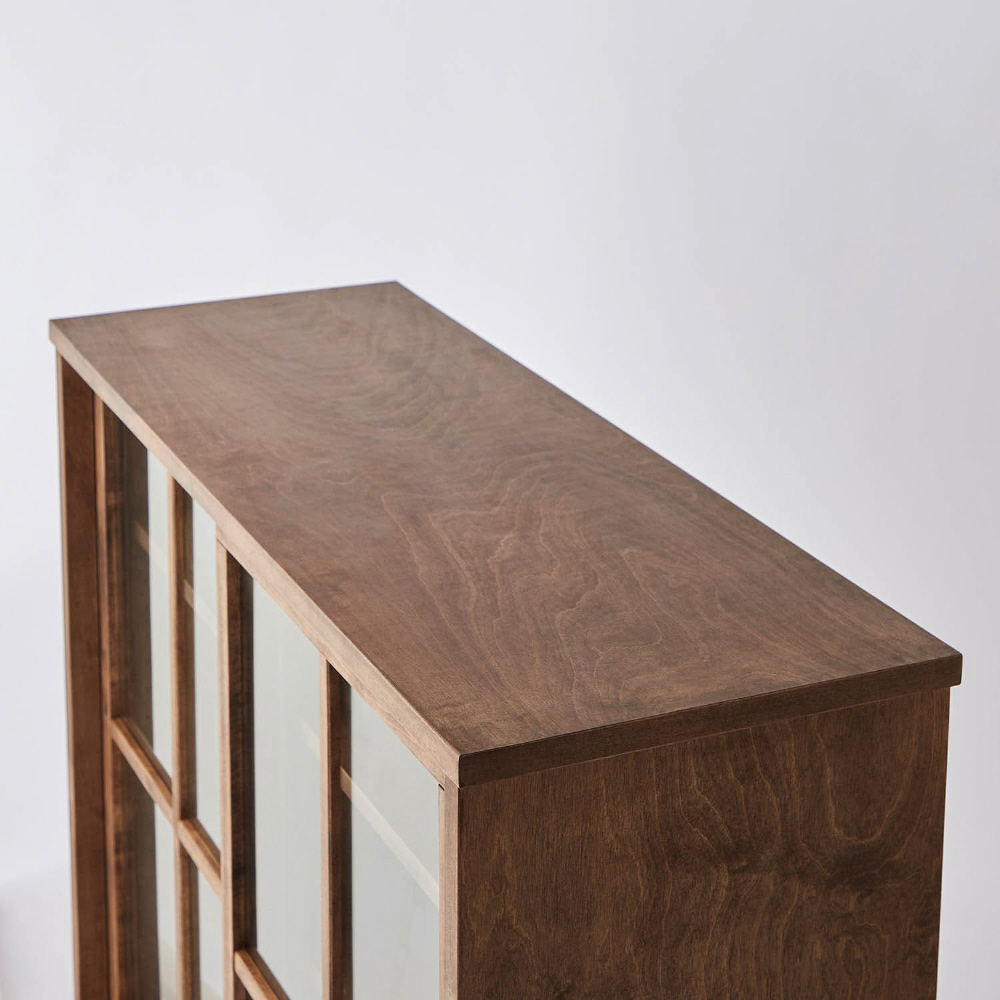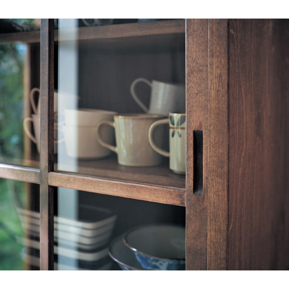 ●主材/引出し前板・引戸枠:天然木(樺材<オイルステイン仕上げ>)、本体:天然木化粧合板(樺材<オイルステイン仕上げ>)、3mm厚ガラス
