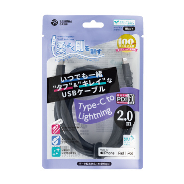 iPhone充電ケーブル Type-C to ライトニングケーブル 2m MFI認証 シリコーン素材 やわらかい 抗菌仕様 SIAA認証 ブラック OB-UCS2CL200-K