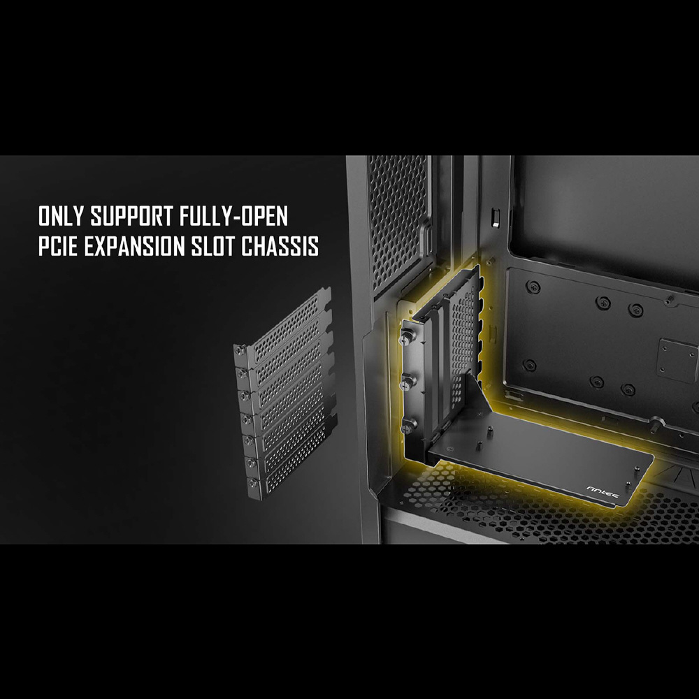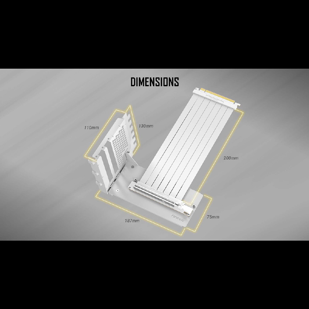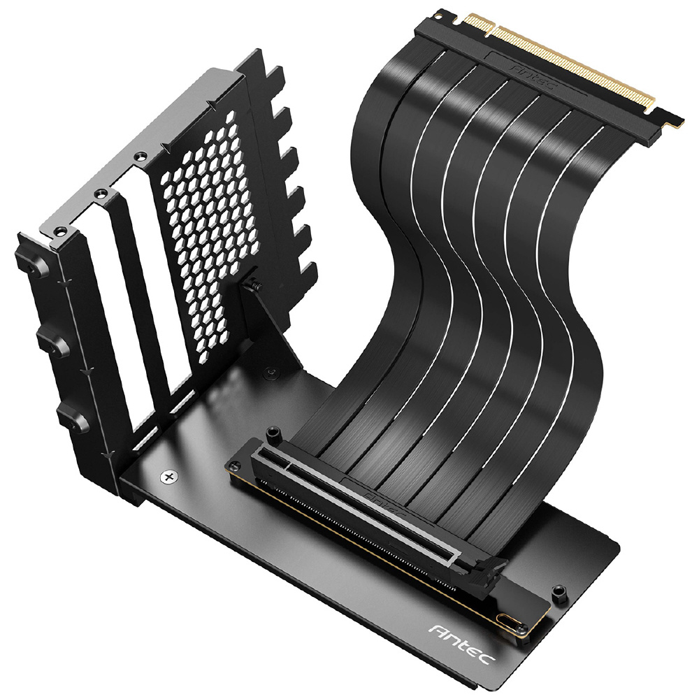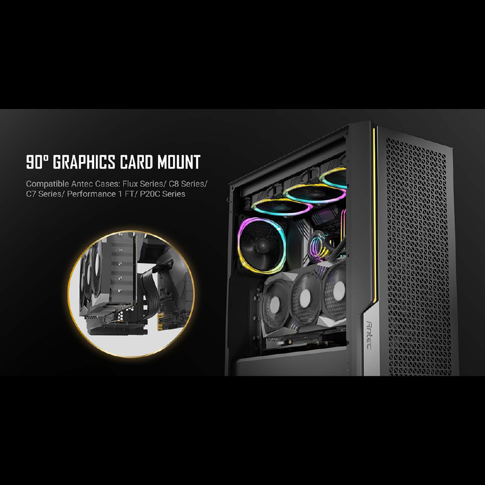Vertical Bracket PCIE 5.0は、Antec製PCケースに対応するグラフィックカード縦置きブラケットとライザーケーブルが一体になった製品です。最大2スロットのグラフィックカードを対応ケースのPCIeスロットにしっかりと固定し、ヒートシンクデザインやライティングを最大限に見せることができます。
