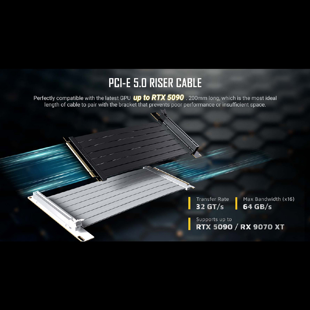 Vertical Bracket PCIE 5.0は、Antec製PCケースに対応するグラフィックカード縦置きブラケットとライザーケーブルが一体になった製品です。最大2スロットのグラフィックカードを対応ケースのPCIeスロットにしっかりと固定し、ヒートシンクデザインやライティングを最大限に見せることができます。PCIe 5.0接続に対応し、ライザーケーブルは余裕ある200 mm長を採用しています。ブラックとホワイトの2色をラインアップ。RTX5090 / RX9070XTまでのグラフィックボードに対応