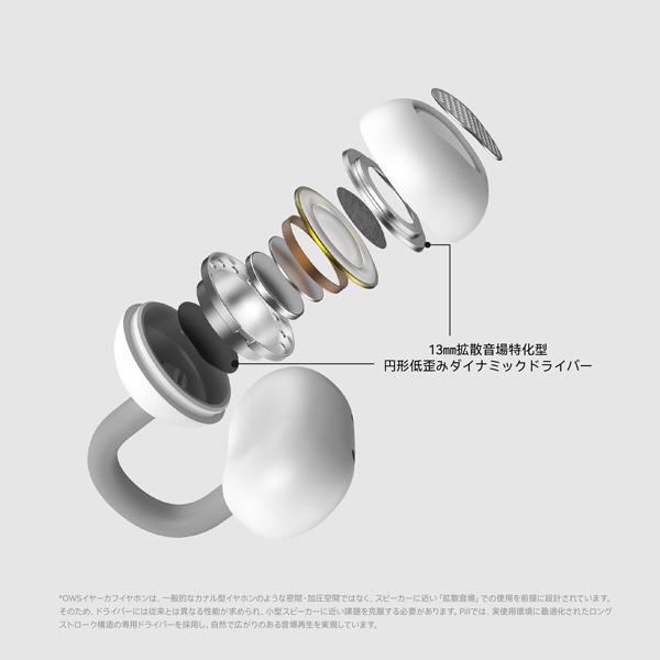 一般的なOWSイヤホンに使用されるドライバーと比べ、円形ダイナミックドライバーは歪みが少なく、よりリニアな再生を実現。