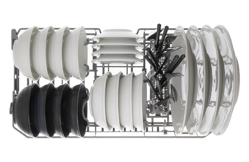 ドアが上に開く「リフトアップオープンドア」採用で、シンク横などの狭いスペースにも置きやすい(※12)。さらに、フラットにたためる上カゴにより、2人分の食器(★1)と調理器具がまとめて洗えます(※12)。※12設置条件は必ずご確認ください。★1日本電機工業会自主基準による。