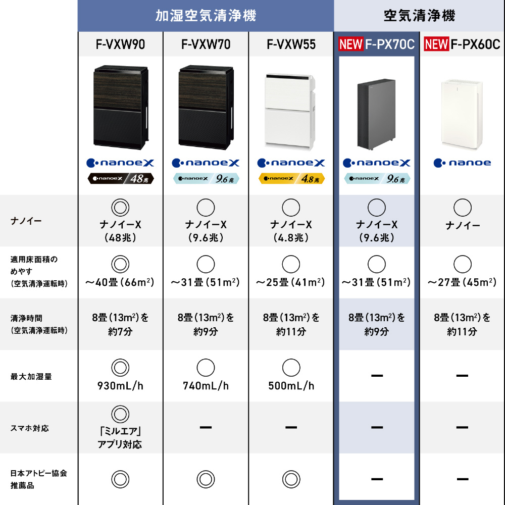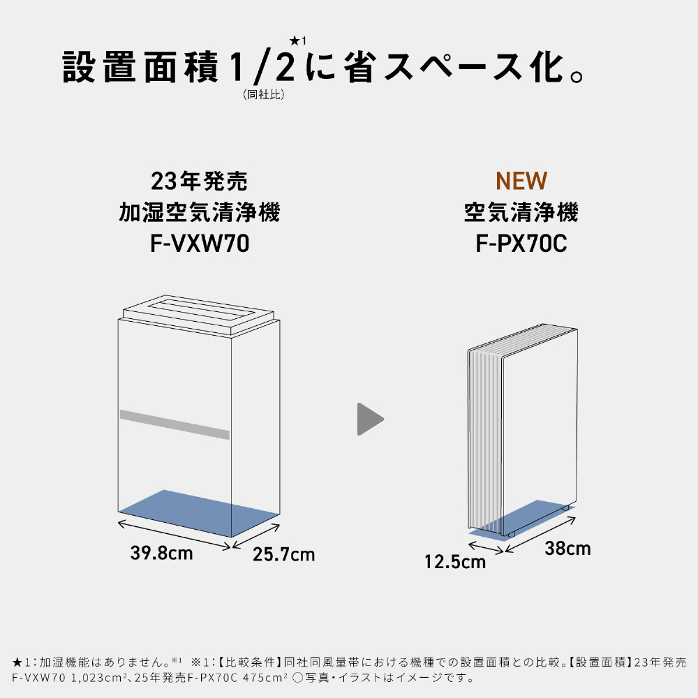 ※1【比較条件】当社同風量帯における機種での設置面積との比較。【設置面積】23年発売F-VXW70 1,023?、25年発売F-PX70C 475?