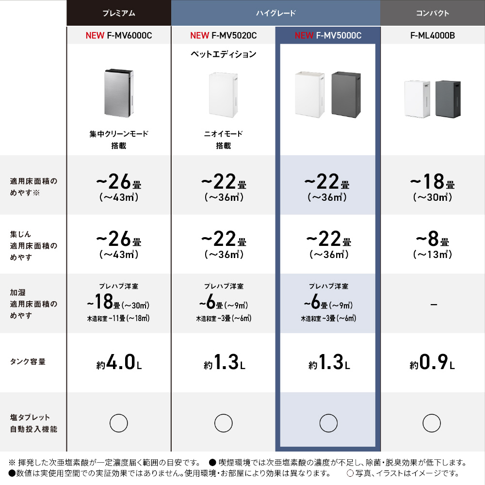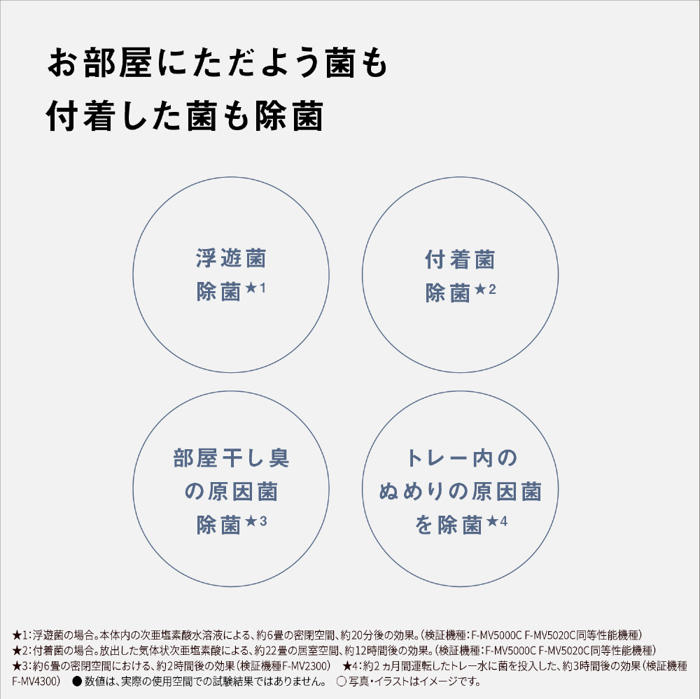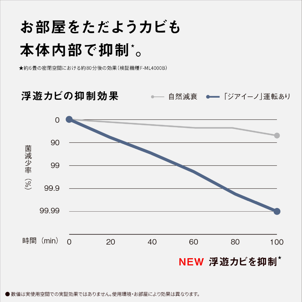 ★浮遊菌の場合、本体内の次亜塩素酸水溶液による、約6畳の密閉空間、約35分後の効果。 付着菌の場合、放出した気体状次亜塩素酸による、約18畳の居室空間、約12時間後の効果。(検証機種:F-ML4000B)