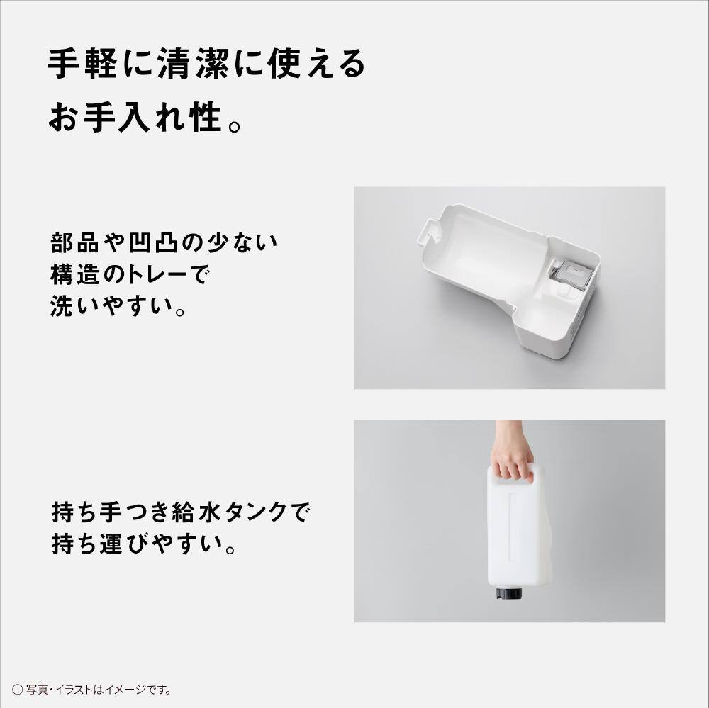 ・持ちやすい取っ手付の給水タンク/凹凸が少なくお手入れのしやすいフラットトレーを採用