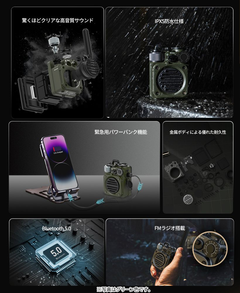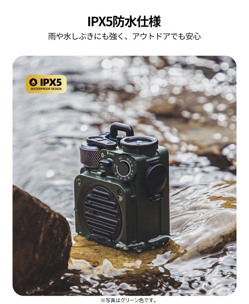 突然の雨や水しぶきも安心。IPX5相当の耐水性能で、キャンプ・BBQ・釣りなど、さまざまなアウトドアシーンで大活躍します。