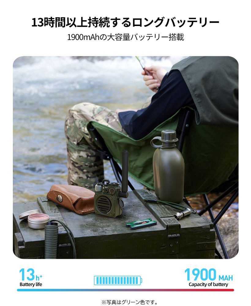 第二世代に比べ約1.9倍のバッテリー容量を実現。音楽再生はもちろん、LEDライトやFMラジオ使用時も安心の持続力です。