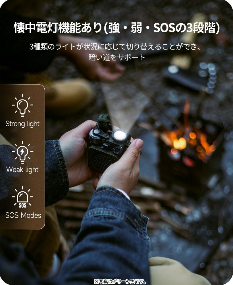 スピーカー上部には3モード対応のLEDライトを搭載。夜間の使用や災害時のSOS発信にも使える実用的なライトです。