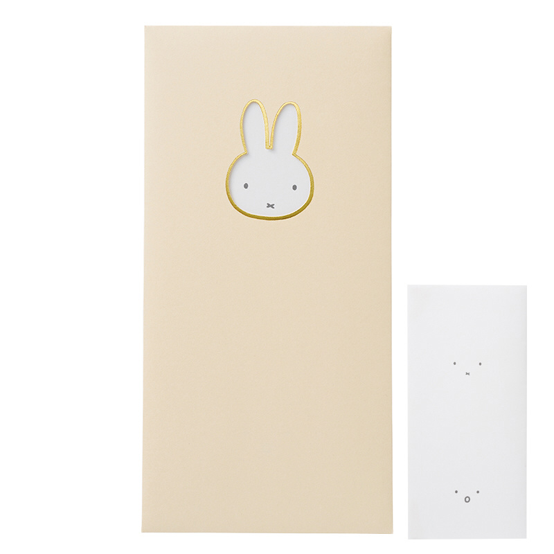 窓から覗く表情を自由に差し替えて、表情の変化を楽しめるのし袋。多目的用途に合わせてお使いいただける、字なしタイプ。窓が描くシンプルな「ミッフィー」のシルエットで表現。心を込めて、時節に合わせてお使いいただけます。本体の紙色は、パステルイエローです。添紙の表裏を差し替えて入れると、窓から覗く表情を2種から選べます。きらりと艶めく箔押しは「日常の特別感」を表現しています。