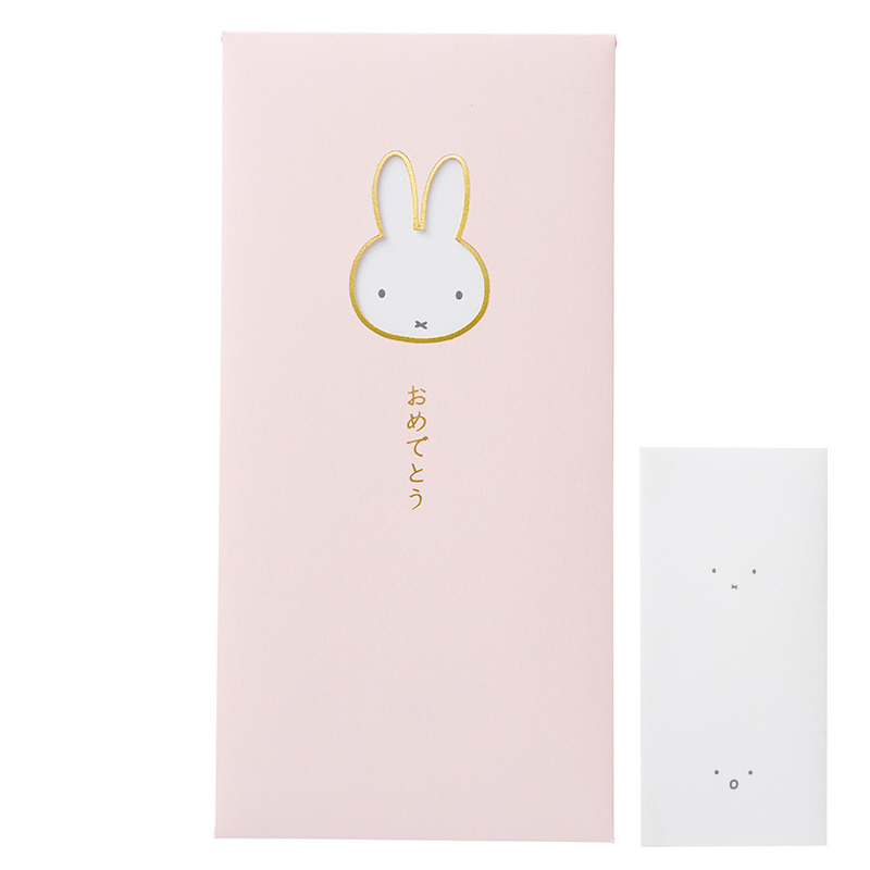 窓から覗く表情を自由に差し替えて、表情の変化を楽しめるのし袋。表書きは「おめでとう」。窓が描くシンプルな「ミッフィー」のシルエットで表現。心を込めて、時節に合わせてお使いいただけます。本体の紙色は、パステルピンクです。添紙の表裏を差し替えて入れると、窓から覗く表情を2種から選べます。添紙を引き出すと、ミッフィーの表情が変化します。きらりと艶めく箔押しは「日常の特別感」を表現しています。