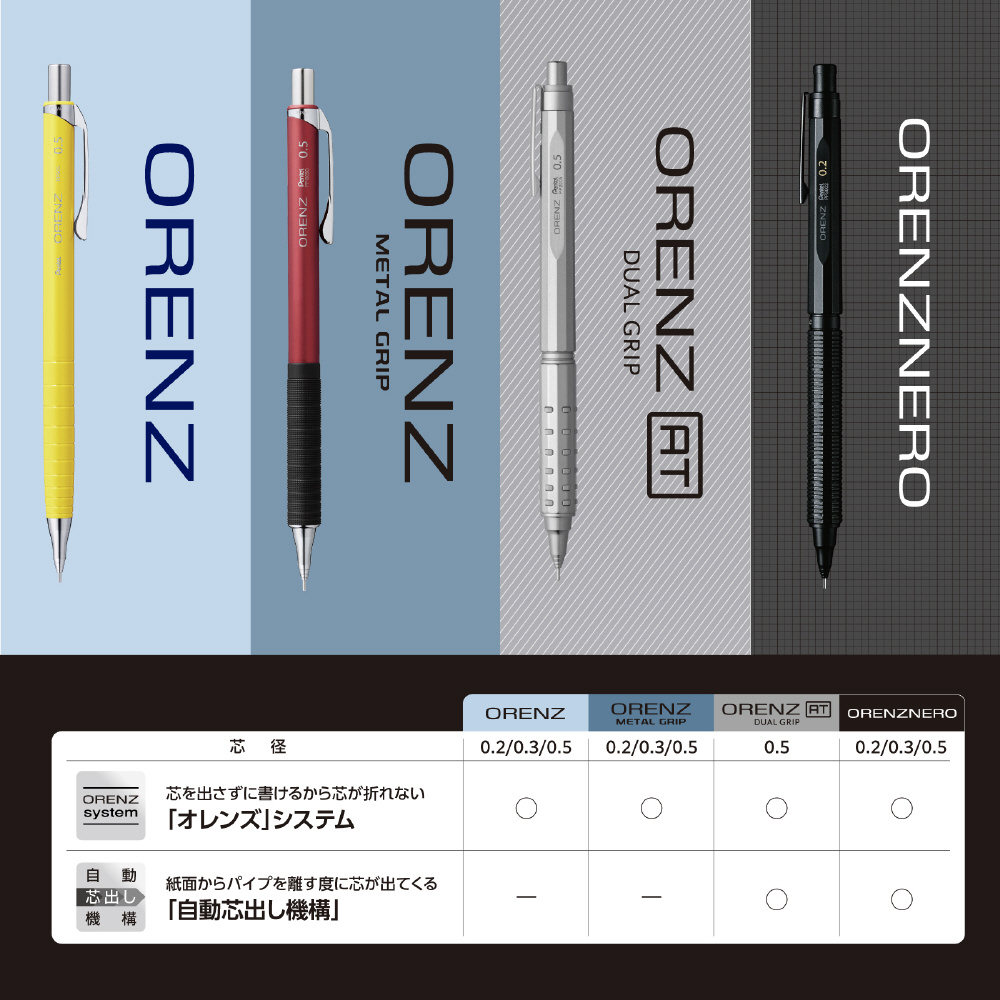 オレンズは、芯を守りながら書く不思議なシャープペンシルです。極細の芯でも折れずに、1回ノックするだけで筆記可能。1秒を争う試験の時や、ふと思いついたアイデアをすばやくメモしたい時に活躍するシャープペンシルです。メタルグリップにはブロック状のローレットを採用。プラスチックを大幅に減らした紙製ブリスター入り。(リニューアル前製品から75%減・2025年8月リニューアル)