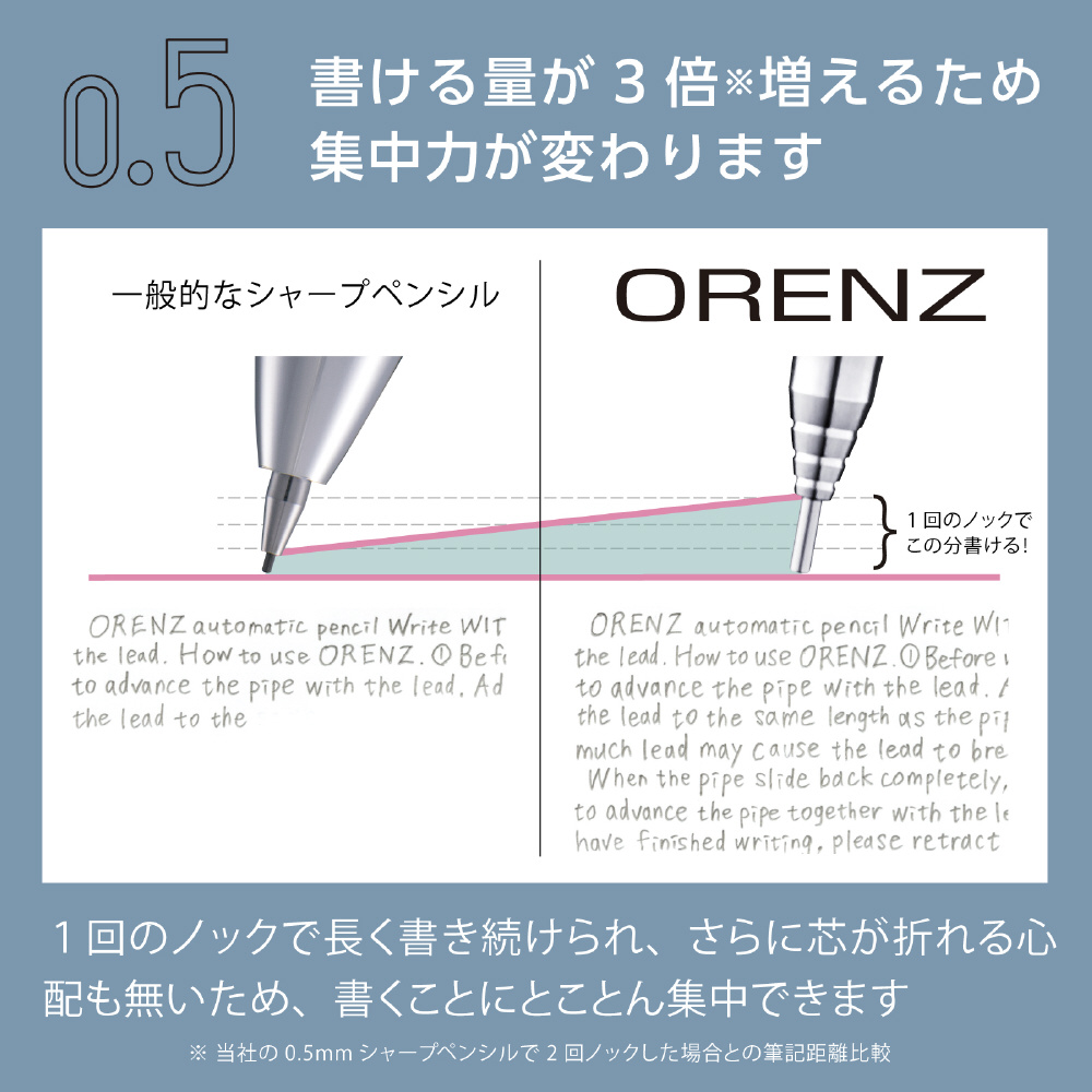 オレンズは、芯を守りながら書く不思議なシャープペンシルです。極細の芯でも折れずに、1回ノックするだけで筆記可能。1秒を争う試験の時や、ふと思いついたアイデアをすばやくメモしたい時に活躍するシャープペンシルです。メタルグリップにはブロック状のローレットを採用。プラスチックを大幅に減らした紙製ブリスター入り。(リニューアル前製品から75%減・2025年8月リニューアル)