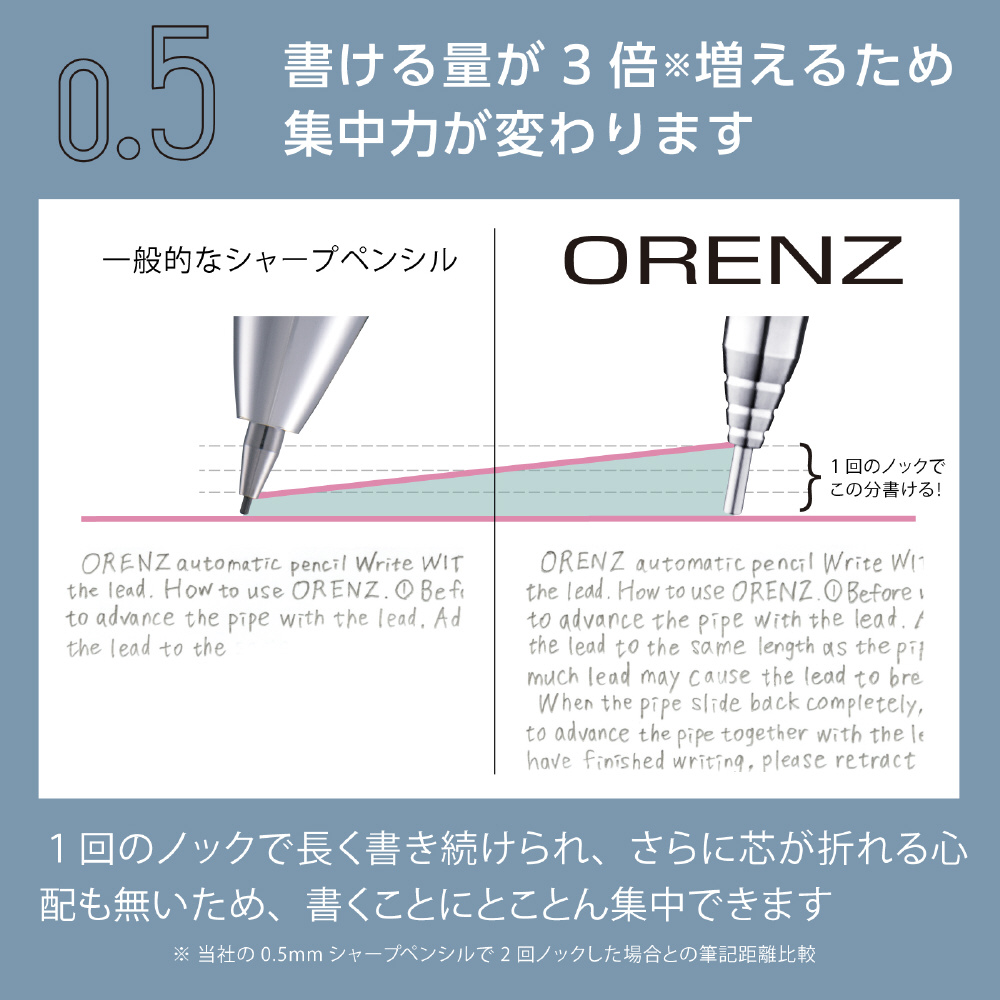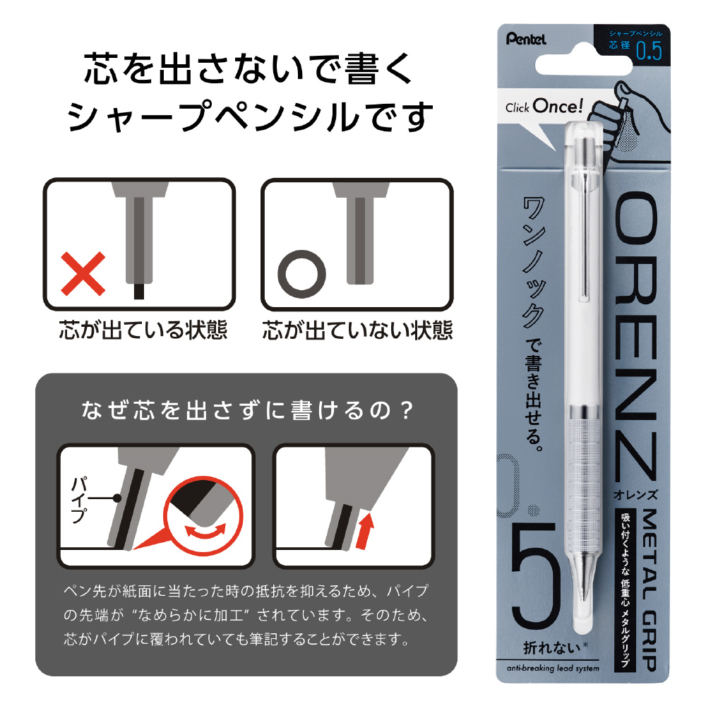 オレンズは、芯を守りながら書く不思議なシャープペンシルです。極細の芯でも折れずに、1回ノックするだけで筆記可能。1秒を争う試験の時や、ふと思いついたアイデアをすばやくメモしたい時に活躍するシャープペンシルです。メタルグリップにはブロック状のローレットを採用。プラスチックを大幅に減らした紙製ブリスター入り。(リニューアル前製品から75%減・2025年8月リニューアル)