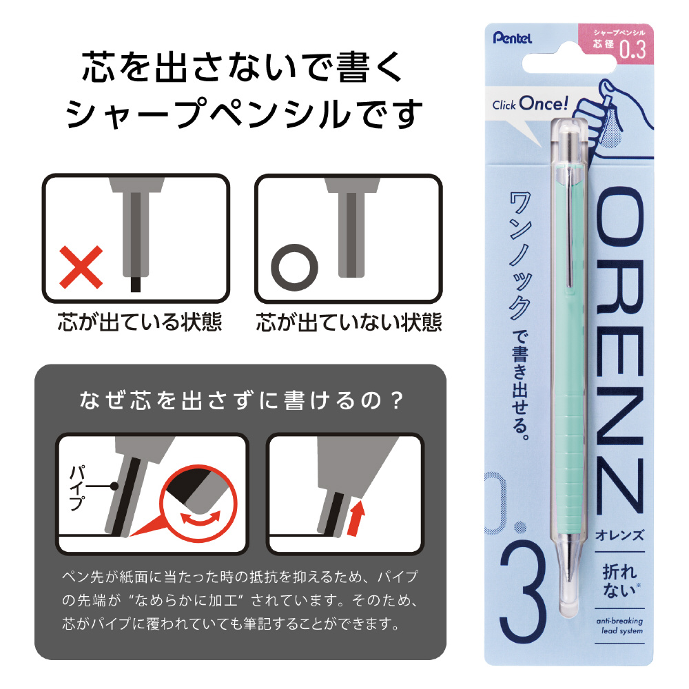 オレンズは、芯を守りながら書く不思議なシャープペンシルです。極細の芯でも折れずに、長く書き続けられます。ペン先が収納されている状態から、1回ノックするだけで筆記可能。1秒を争う試験の時や、ふと思いついたアイデアをすばやくメモしたい時に活躍するシャープペンシルです。3芯径、全16モデルであなたのお気に入りがきっと見つかります。よりなめらかに、より濃く書けるB芯を内蔵。プラスチックを大幅に減らした紙製ブリスター入り。(リニューアル前製品から75%減・2025年8月リニューアル)