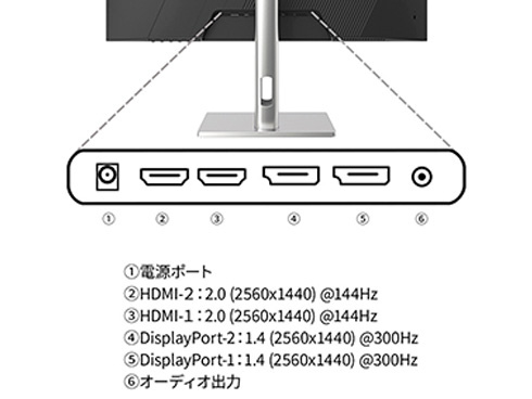 ■インターフェイスは、HDMI 2.0 x2 (144Hz)とDisplayPort 1.4 x2 (300Hz)を搭載し、PCやコンソールゲーム機など様々な機器と接続が可能です。