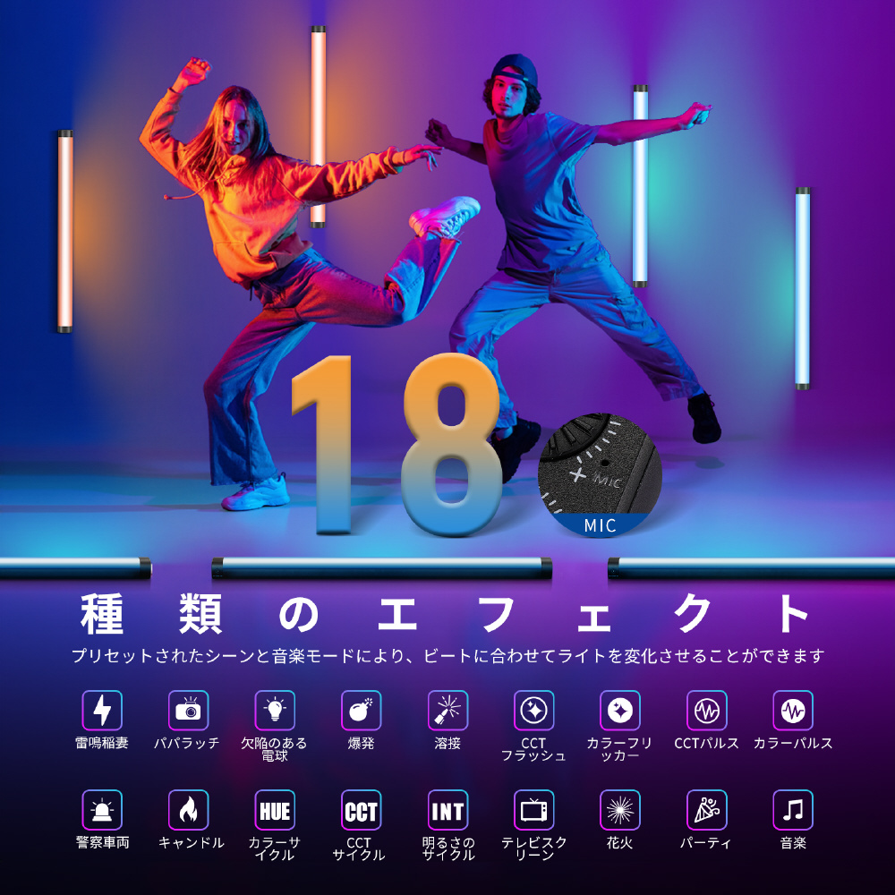 8.つの独立して制御可能なピクセルを使用して、各セクションの明るさ、色温度、ピクセル効果を個別に調整できます。7.つのピクセル効果と1.8.の特殊シーン効果があり、撮影画像を際立たせます。さらに、「ミュージックシーン」では、音楽に合わせて照明が、ビートに合わせて色を変えることもできます。
