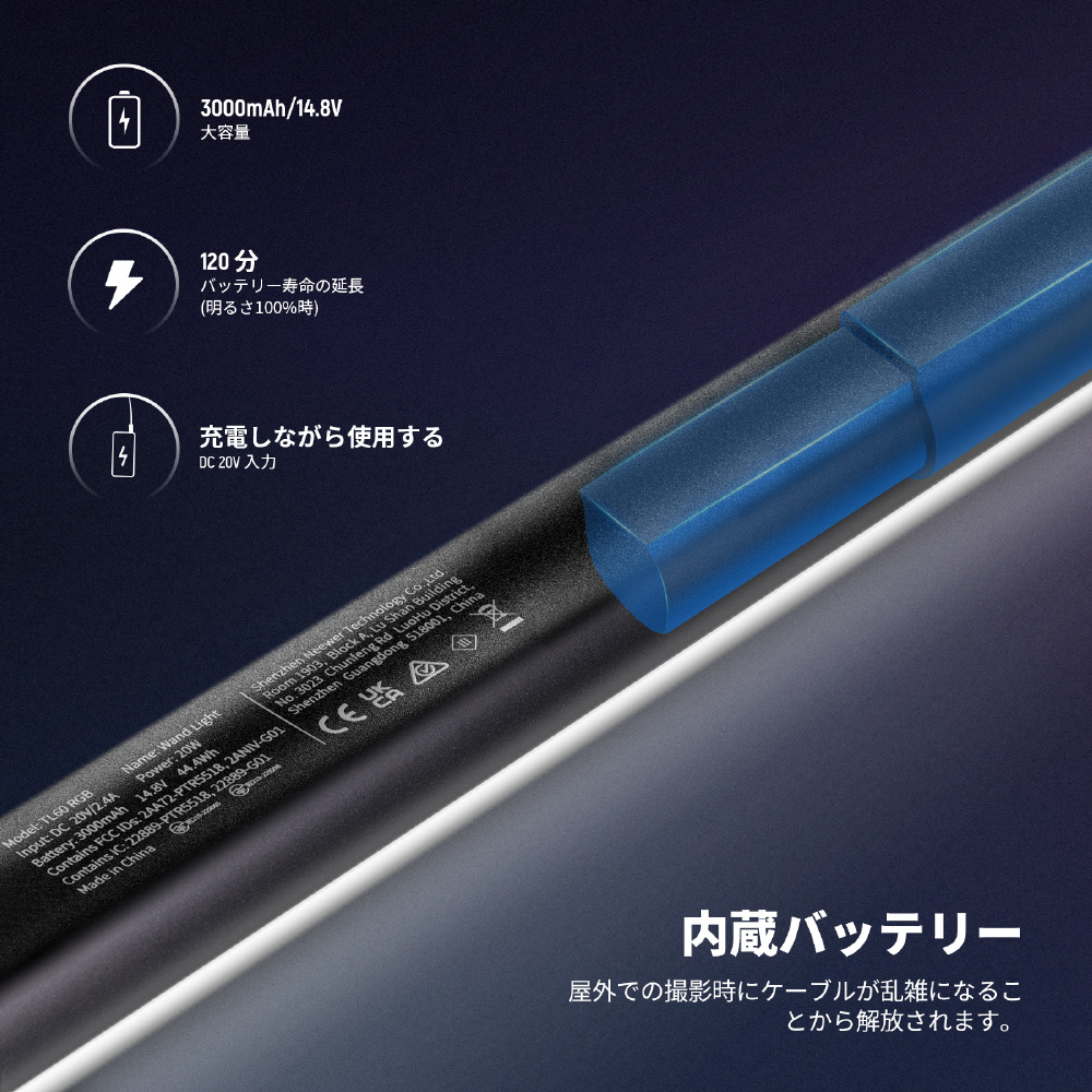 重さは (8.2..0g)、長さは (4.2..x6.6.5.mm)で、持ち運びやすく、ハンドヘルドLEDビデオライトとして最適です。線形光源、ビーム角1.8.0°、形状も美しく、モデリングライトとして使用できます。3.000mAh内蔵バッテリーは、フルパワーで1.2..0分の使用可能です 付属の電源アダプターは使用可能です