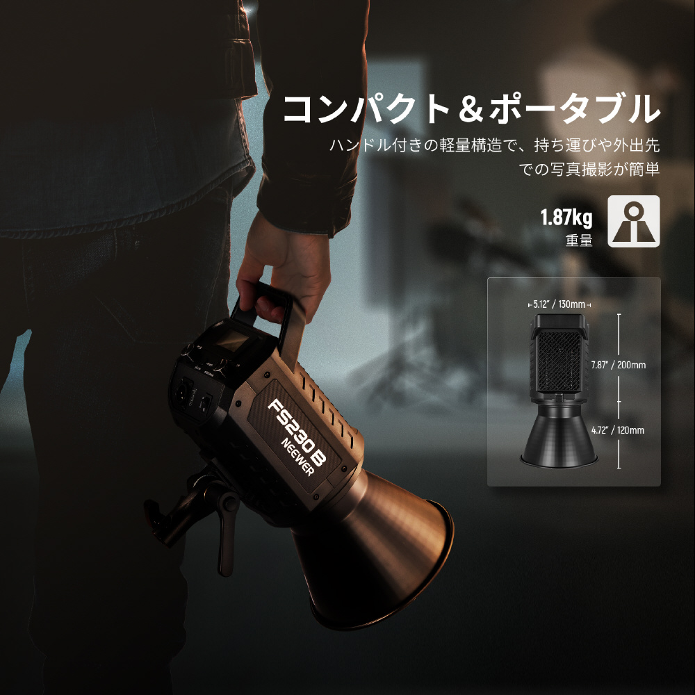 ハンドル付きの軽量構造(1..8.7.kg)で、持ち運びや外出先での写真撮影が簡単です。
