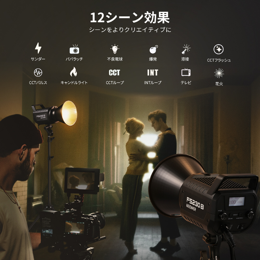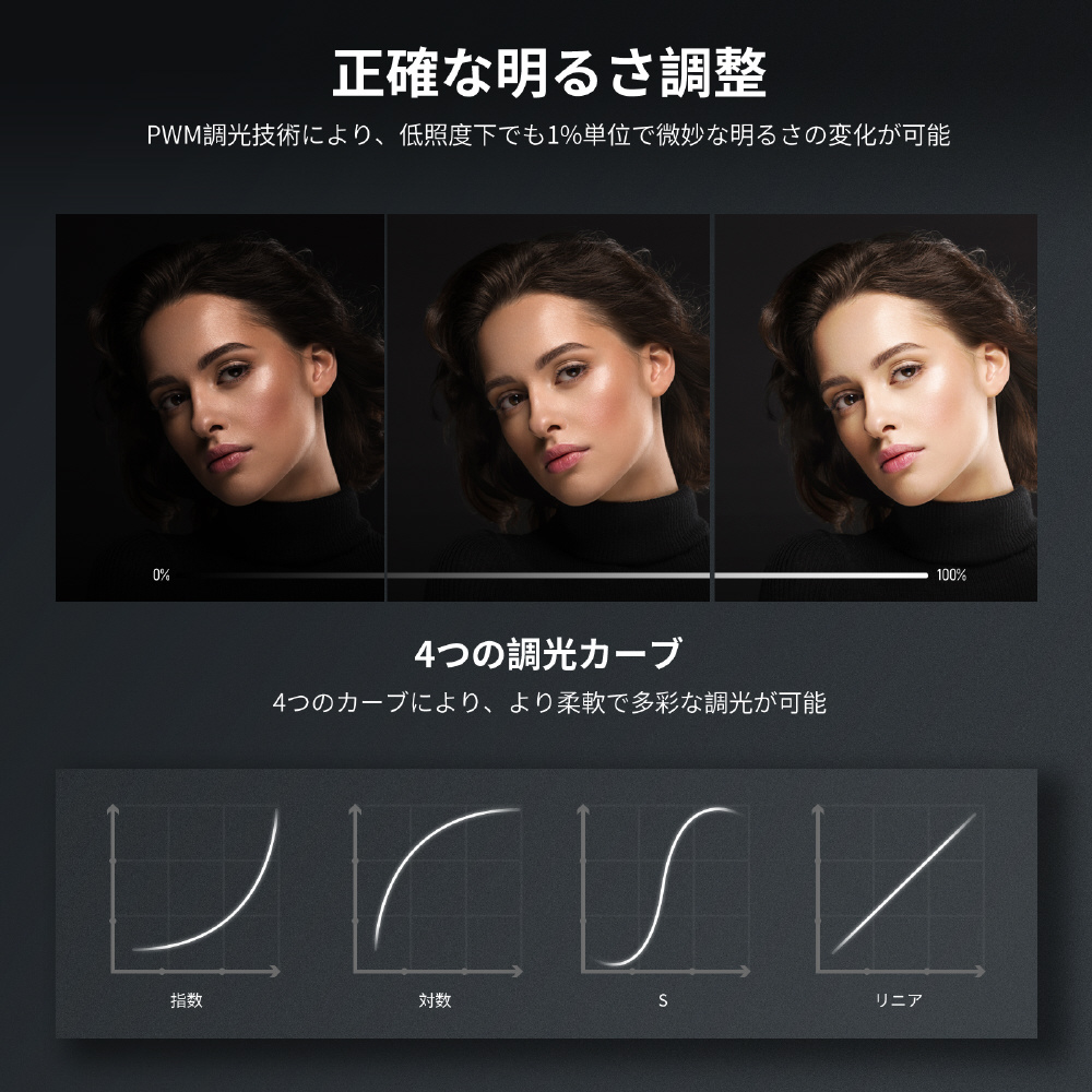 PWM技術搭載で0-1.00%無段階で正確な調光が可能です。4.つの調光パターン(指数関数、対数、S、線形) により、正確な照明調整を可能にします。CRI 9.7.+、TLCI 9.8.+の超高演色性により、被写体の色彩を忠実に再現。2..7.00K-6.5.00Kのデュアルカラー調光で暖色から寒色まで瞬時に切り替えます。1.2..種類の照明効果により異なるシナリオプリセットで映像クリエイターの多様な創作ニーズに対応します。