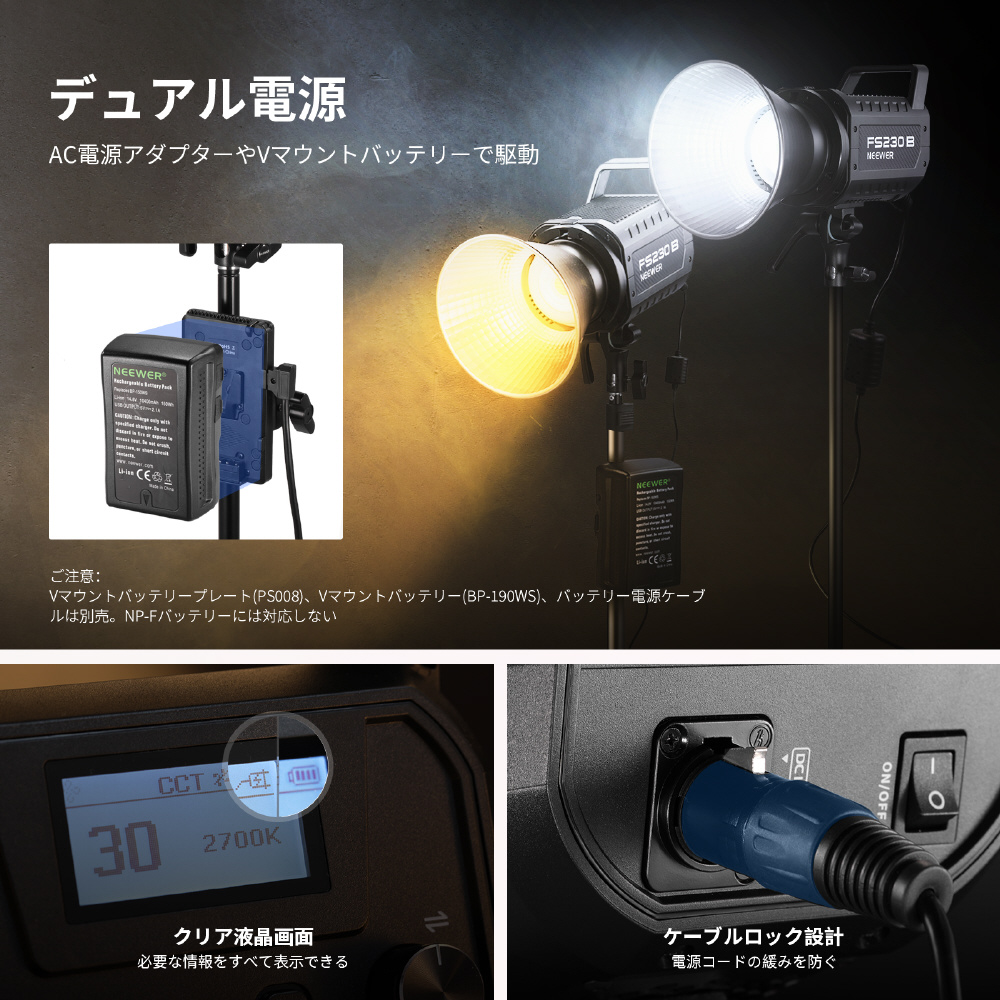 電源アダプターと電源コードを備え、屋内でノンストップで使用できます。XLR電源入力にはケーブルロックが装備されており、ケーブルの緩みを防ぎ、安定した照明を実現します。また、ライトはVバッテリー(別売)を使用することで、無線照明を実現できます。Vマウントバッテリーの出力電圧は1.6..8.Vです。