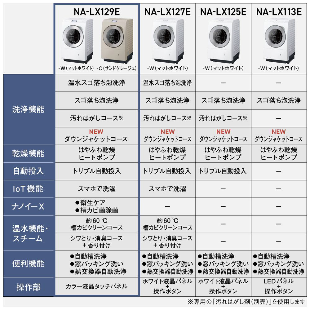 ※1 洗濯〜乾燥おまかせコース・定格洗濯乾燥6kg時。パナソニック2024年度モデルNA-LX129D(約890Wh)とNA-LX129E(約800Wh)の消費電力量比較。衣類の素材・入れ方・洗濯時の状況により、運転時間・消費電力量は前後します。