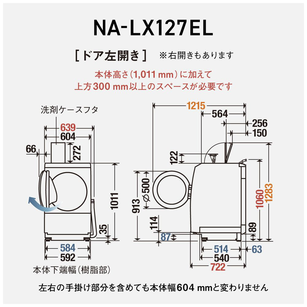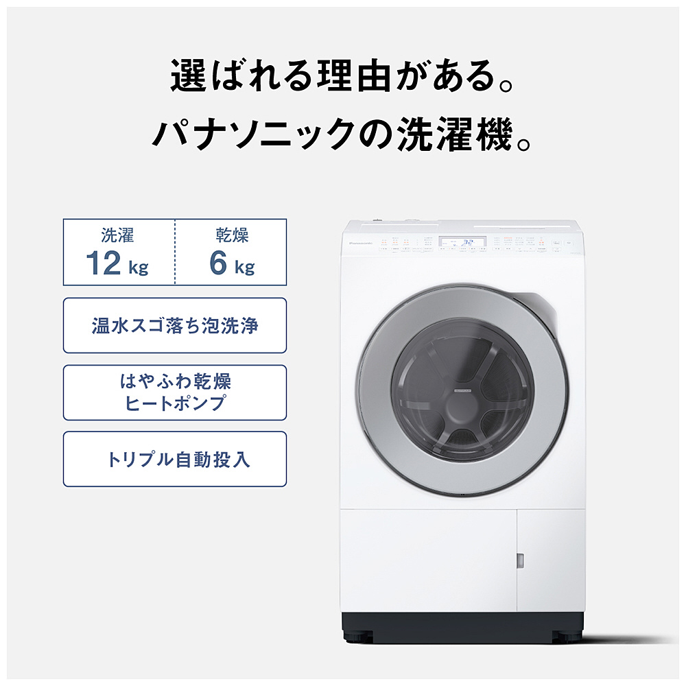 ※1 洗濯〜乾燥おまかせコース・定格洗濯乾燥6kg時。パナソニック2024年度モデルNA-LX127D(約890Wh)とNA-LX127E(約800Wh)の消費電力量比較。衣類の素材・入れ方・洗濯時の状況により、運転時間・消費電力量は前後します。